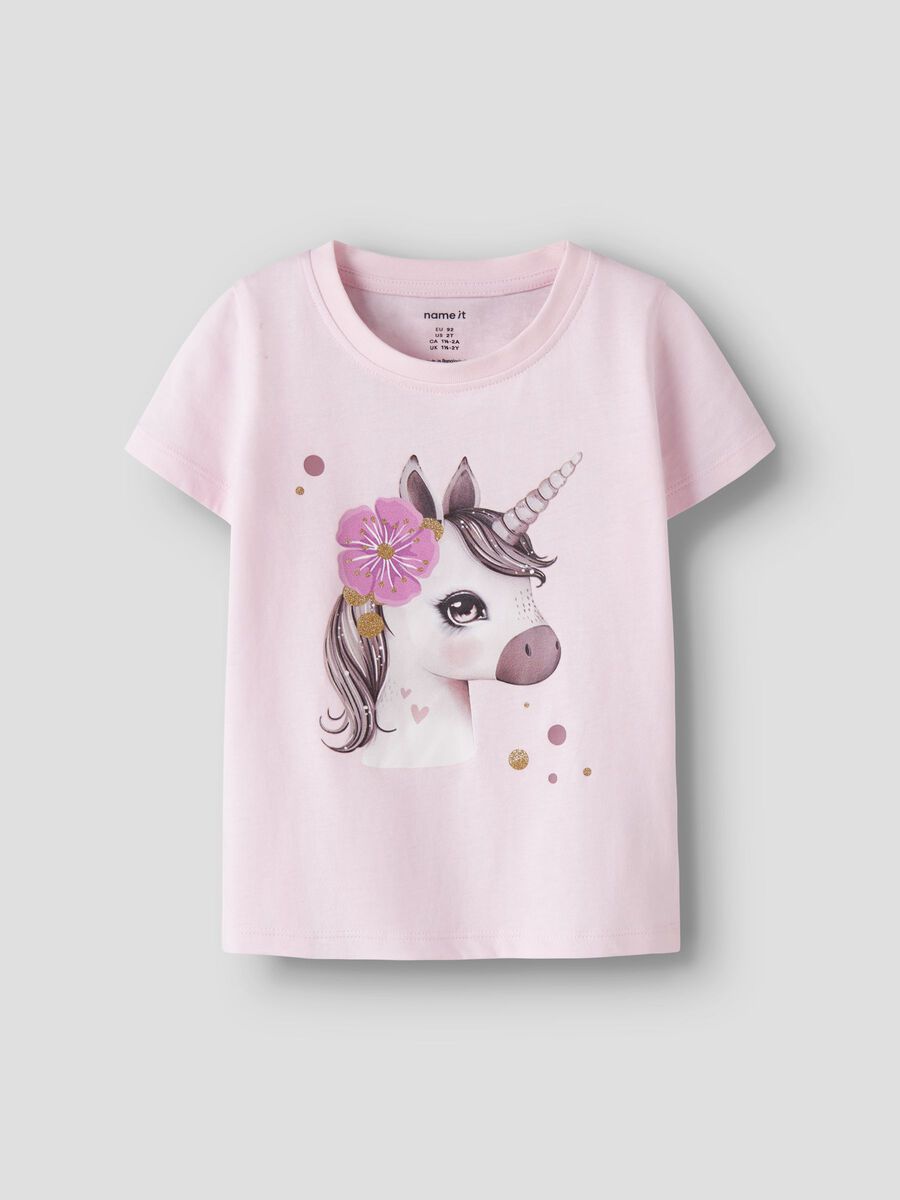 Camiseta en color rosa claro, con divertido print de unicornio en el delantero. Ligera, cómoda y súper fácil de combinar. Y todo, con la súper relación calidad/precio de esta marca escandinava.