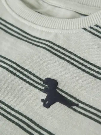 Camiseta en color neutro, con print de rayas y detalle de dinosaurio en el pecho. Ligera, cómoda y súper fácil de combinar. Y todo, con la súper relación calidad/precio de esta marca escandinava.