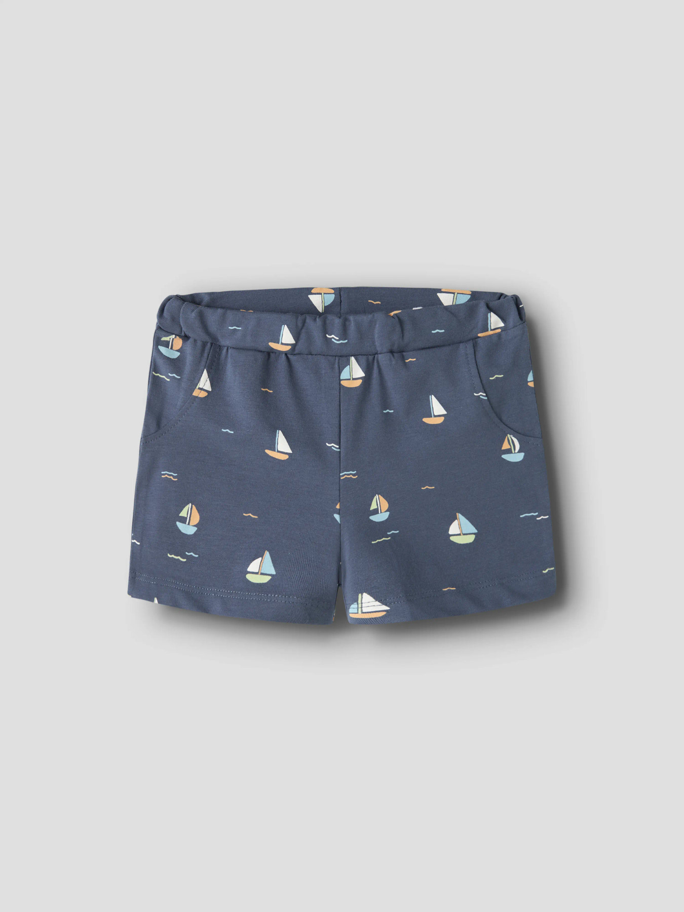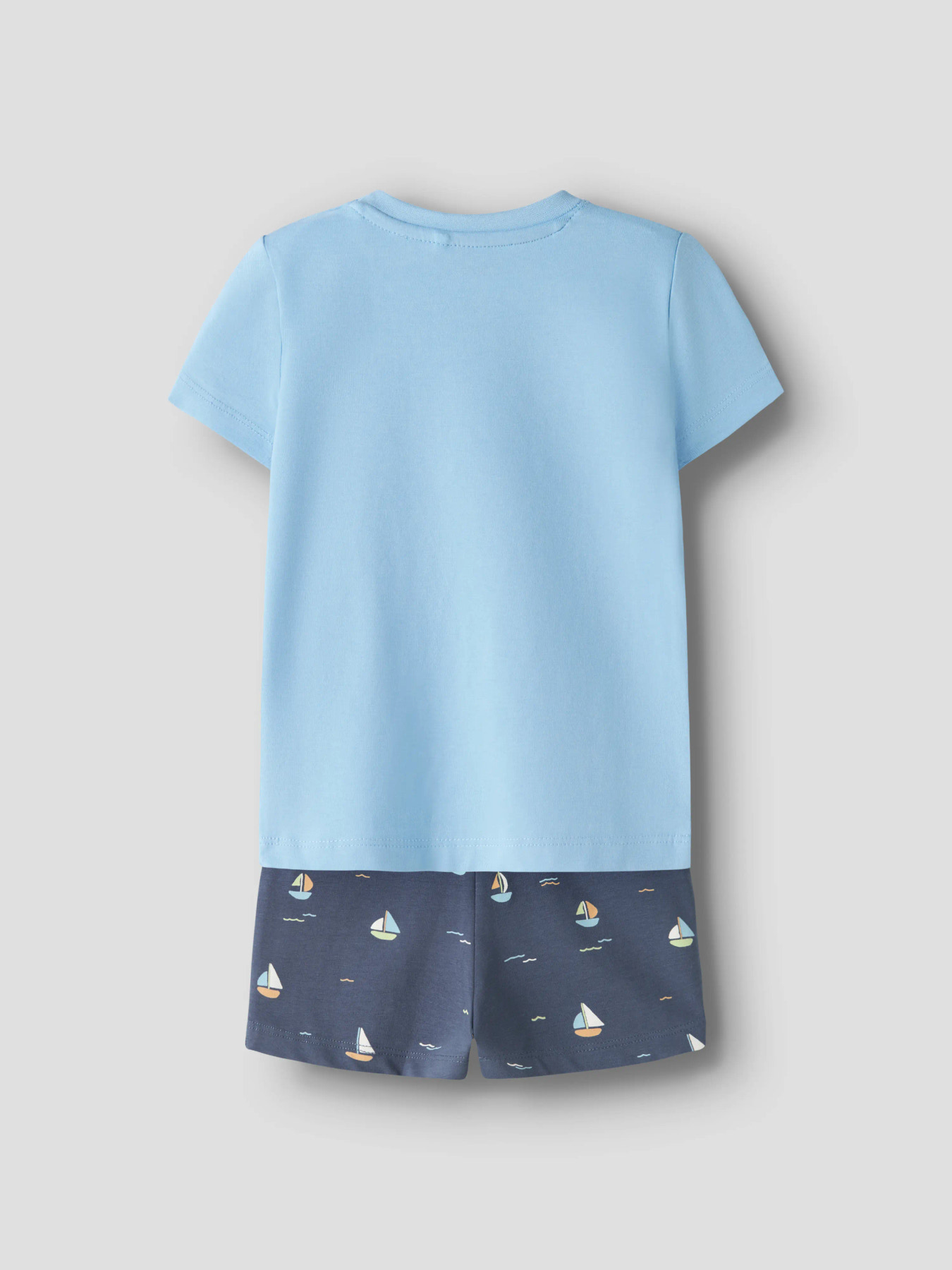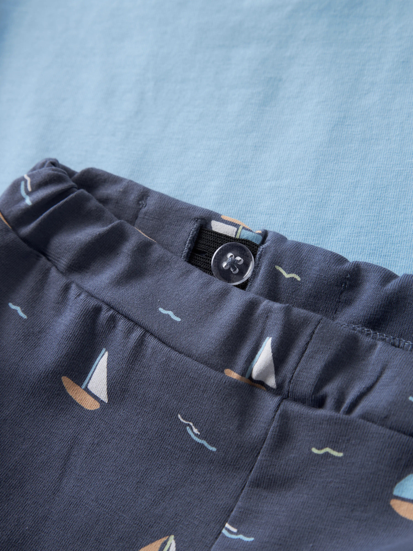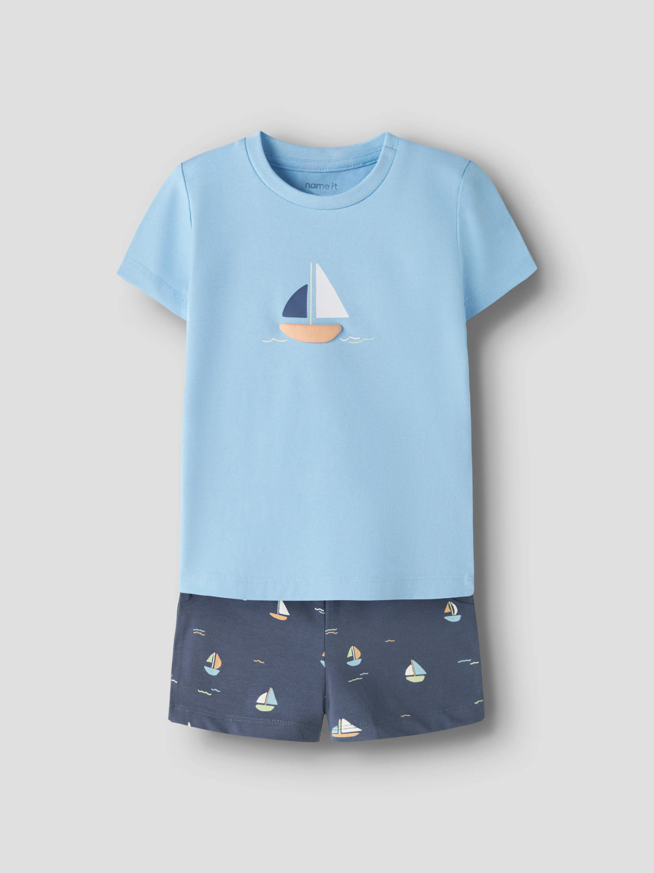 Conjunto de dos piezas compuesto de camiseta de manga corta con imagen de un barco en el pecho, más short estampado a juego. Cómodo, fácil y que les acompañará durante todo el verano. Y con la súper relación calidad-precio de esta marca danesa.