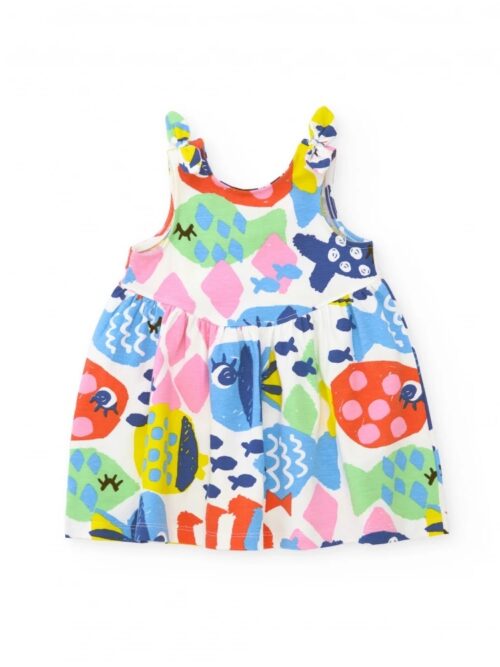 Conjunto compuesto por una camiseta y una bermuda a juego. La camiseta, de base blanca, presenta un estampado multicolor con divertidos animales de estilo artístico que aportan dinamismo y un toque lleno de energía. Su tejido suave garantiza comodidad durante todo el día. La bermuda en tono morado incorpora cintura elástica con cordón amarillo y bolsillos con cierre de cremallera, pensados para aportar practicidad y permitir que el niño guarde pequeños objetos con seguridad. Un conjunto versátil y cómodo, ideal para acompañarlo en sus actividades diarias.