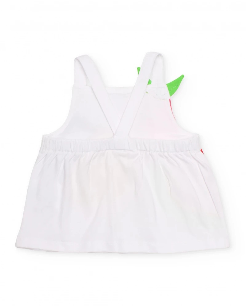 Conjunto compuesto por una camiseta sin mangas en blanco y un pantalón corto en rosa. La camiseta presenta un alegre estampado de frutas a gran tamaño, con detalles en relieve en la parte superior de la fresa que aportan un toque divertido y distintivo. El pantalón corto, de tejido suave y cintura elástica, ofrece comodidad y libertad de movimiento, además de incluir bolsillos funcionales. Un conjunto fresco, cómodo y perfecto para los días más calurosos.