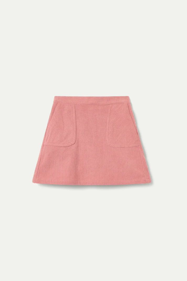 Falda corta en pana de color rosa con diseño evasé y dos bolsillos delanteros. La cintura es elástica en la parte trasera para mejorar el ajuste. Encontraréis por aquí diversas prendas de la misma marca que os combinaran a la perfección.