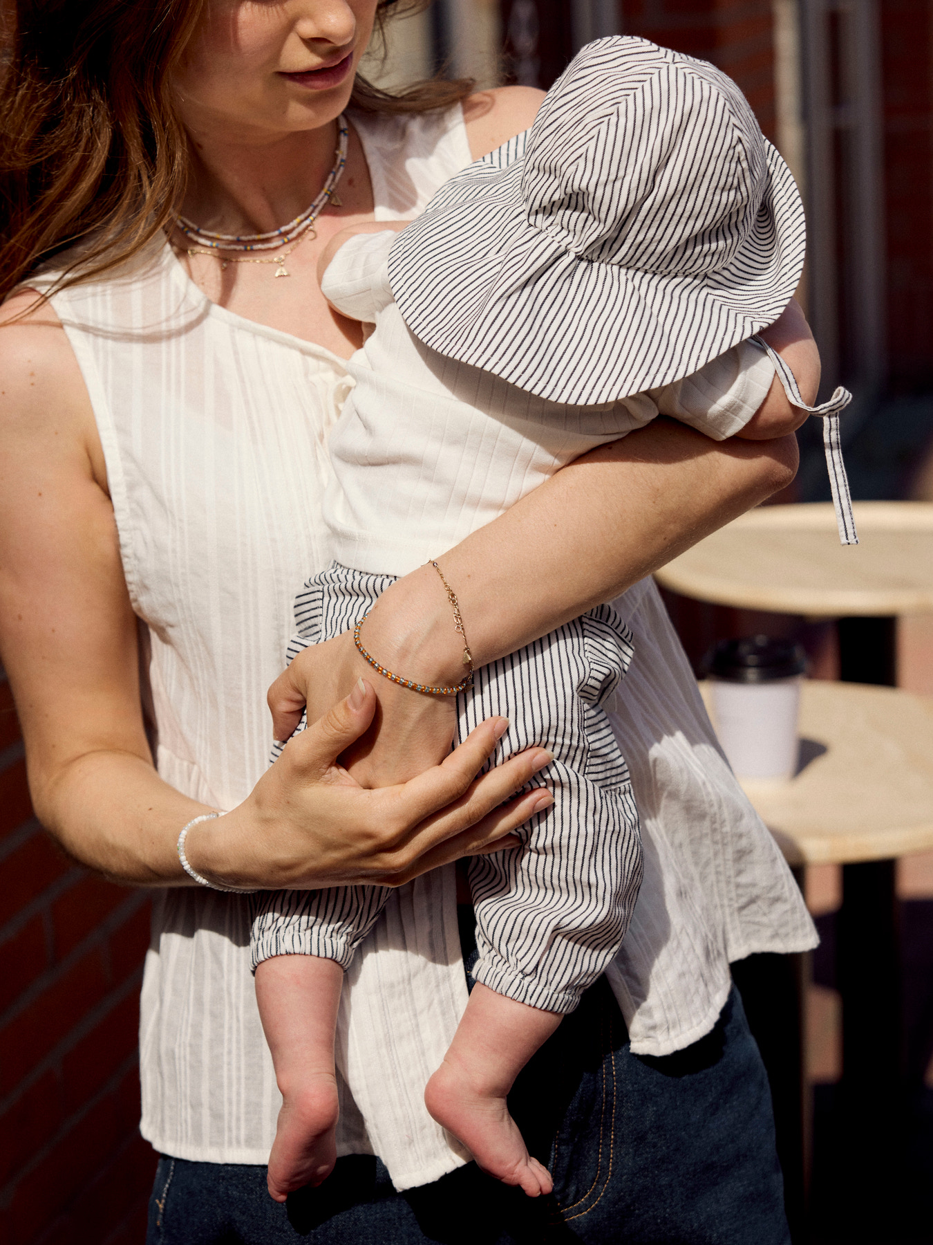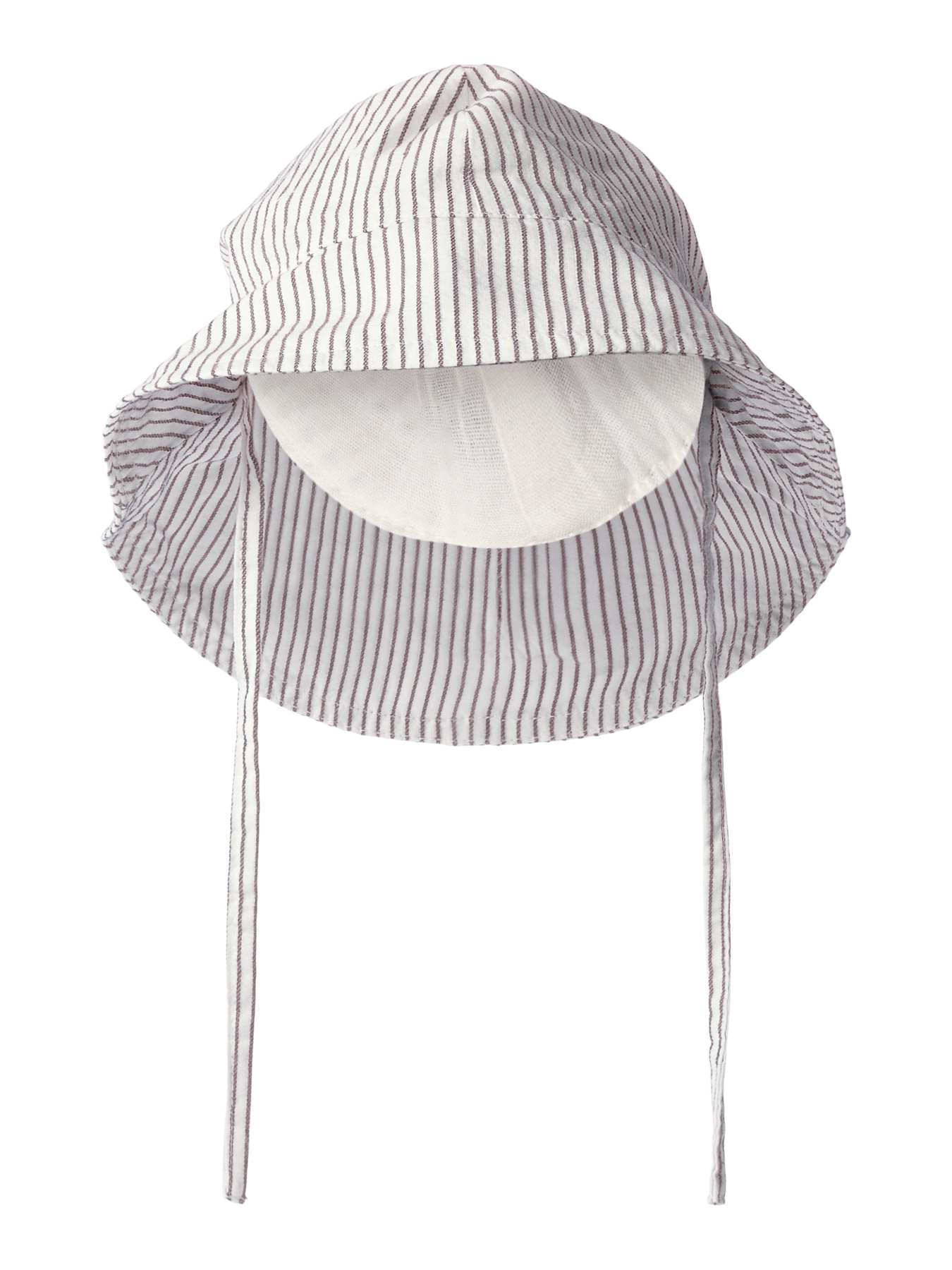 Gorro para proteger del sol con tiras para atar. El ala posterior es más larga, para que les proteja nuca y espalda. Confeccionado en ligero y transpirable algodón orgánico. ¡Un «must» para los bebés en verano! Encontraréis por aquí un peto de tirantes a juego que completa el look.