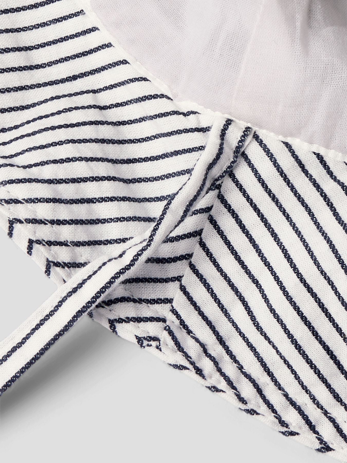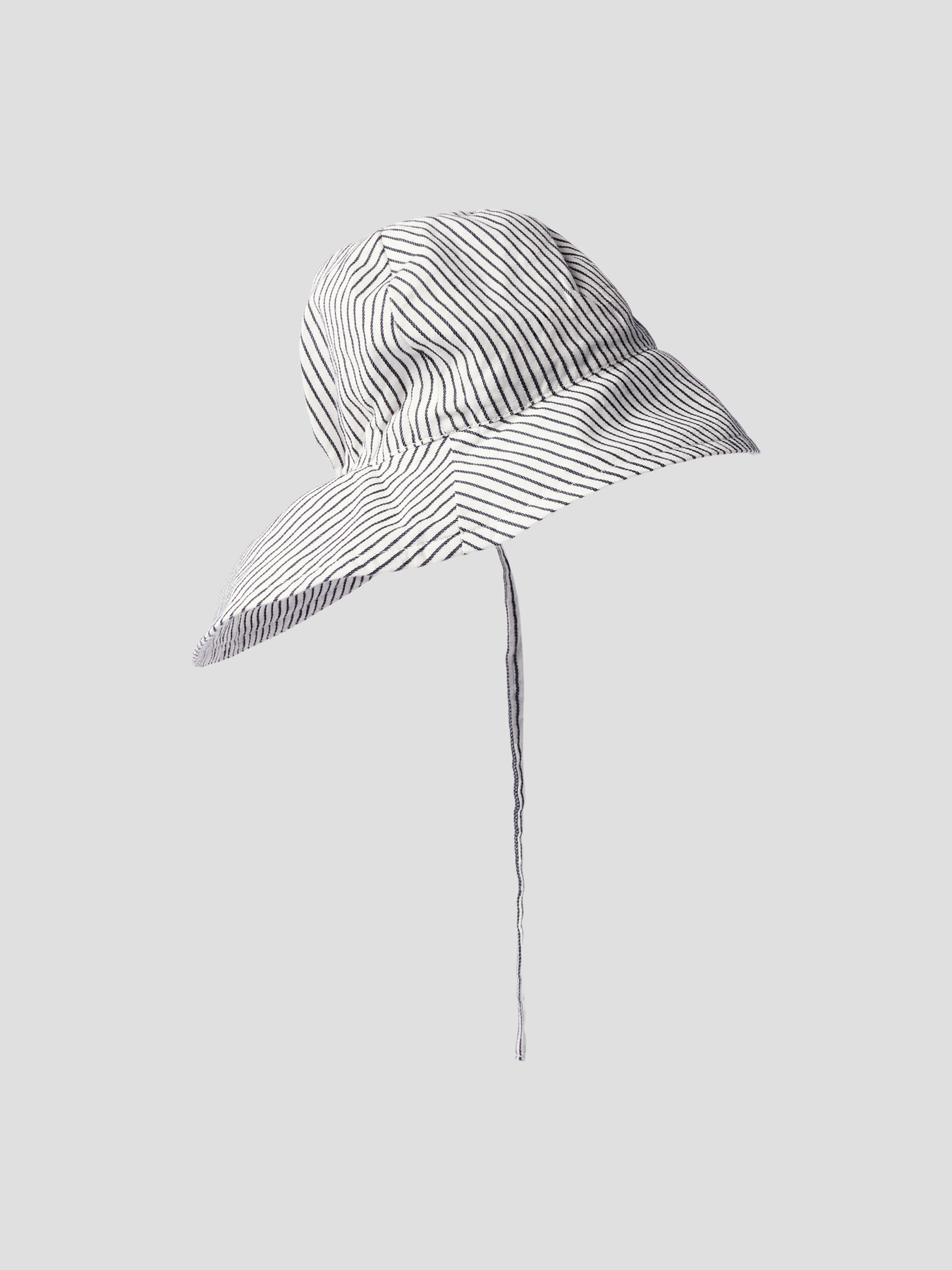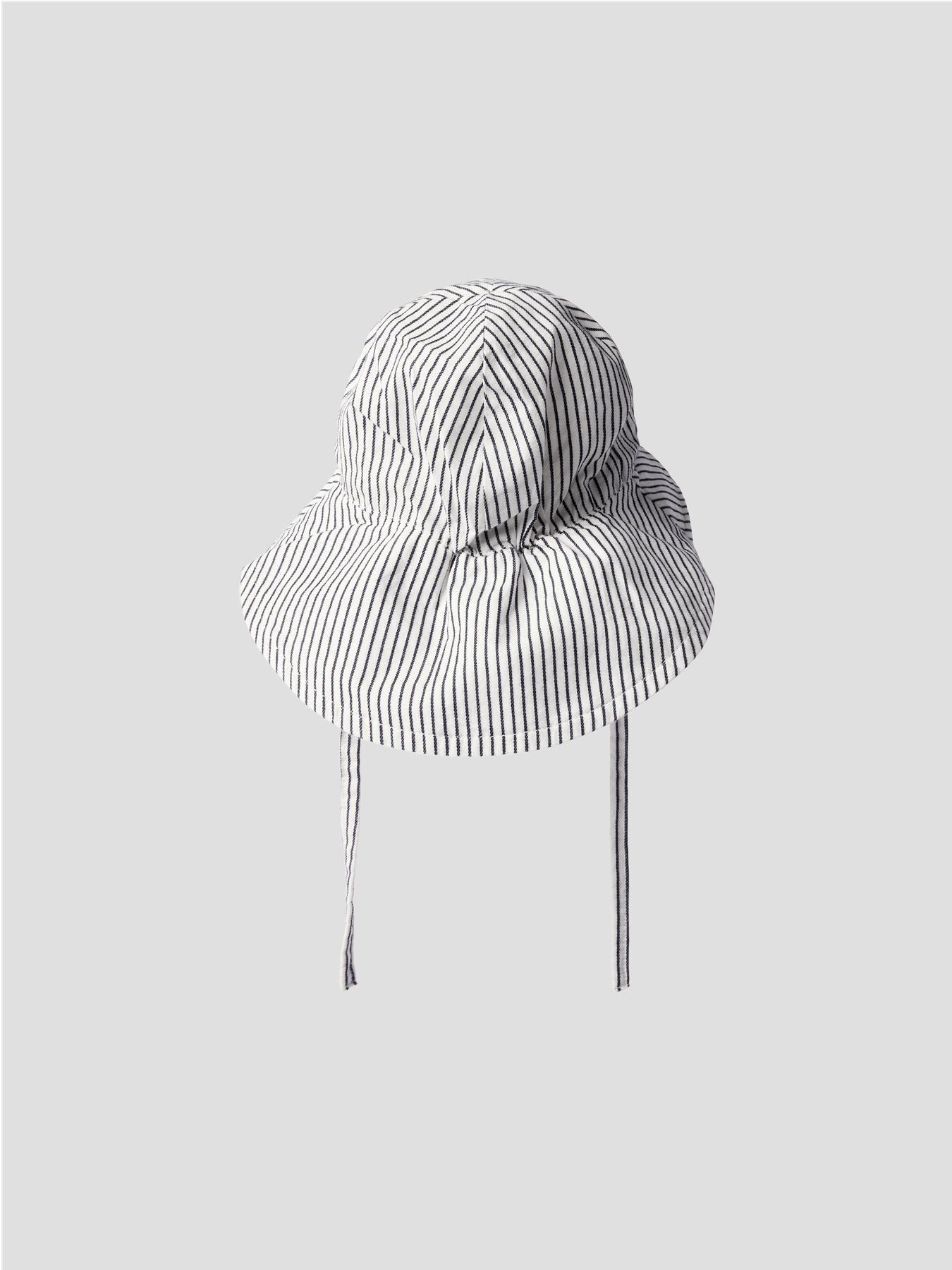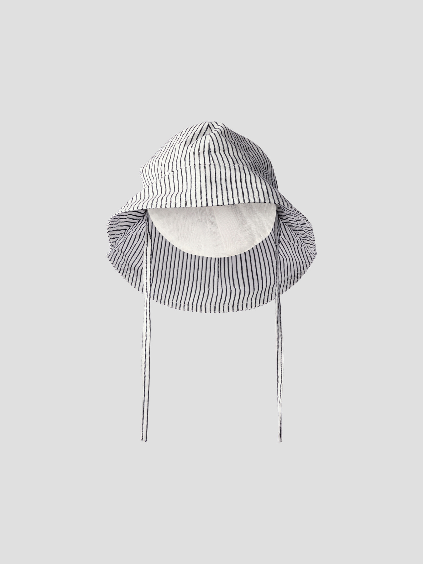 Gorro para proteger del sol con tiras para atar. El ala posterior es más larga, para que les proteja nuca y espalda. Confeccionado en ligero y transpirable algodón orgánico. ¡Un «must» para los bebés en verano! Encontraréis por aquí un peto de tirantes a juego que completa el look.