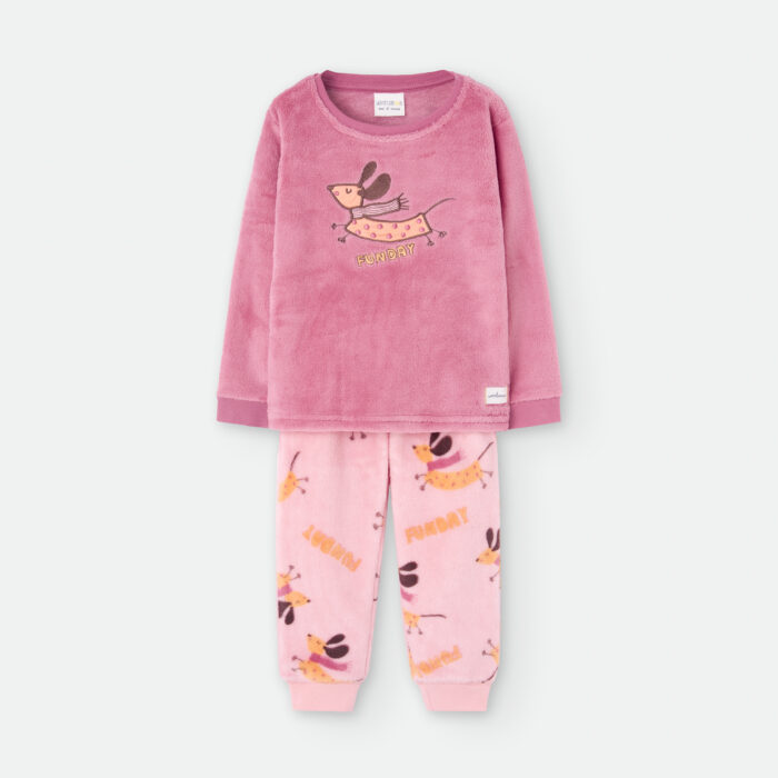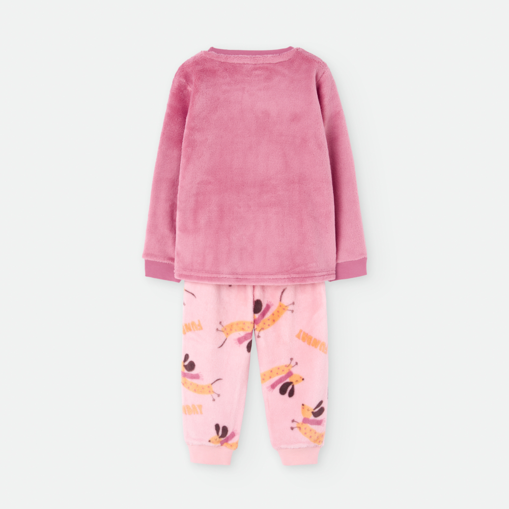 Pijama calentito de dos piezas, con tacto suave. Camiseta con cuello redondo y manga larga con puño. Bordado en el delantero con un perro sobre fondo rosa oscuro. Pantalón largo con estampado integral de perritos sobre fondo rosa claro, cinturilla elástica y puño en el bajo.