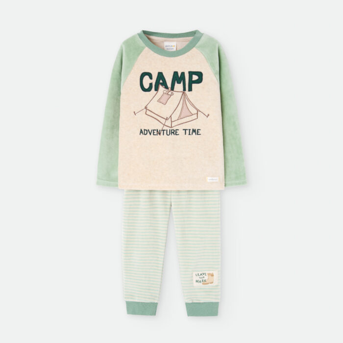 Pijama calentito de dos piezas, con tacto suave. Camiseta con cuello redondo y manga larga ranglan. Bordado en el delantero con una tienda de campaña. Pantalón largo con raya tejida, cinturilla elástica y puño en el bajo.
