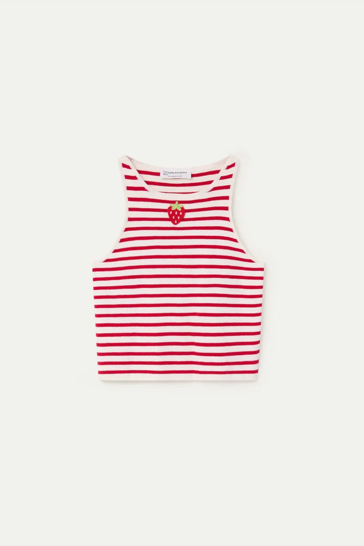 Top de niña con tejido punto estampado de color rayas blanco y rojo. Cuello redondo y sin mangas. Detalle bordado de fresa en el pecho. La modelo mide 127 cm y lleva la talla 8-9 años. Encontraréis una falda de la misma marca por aquí, para completar el outfit.