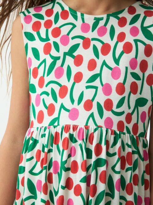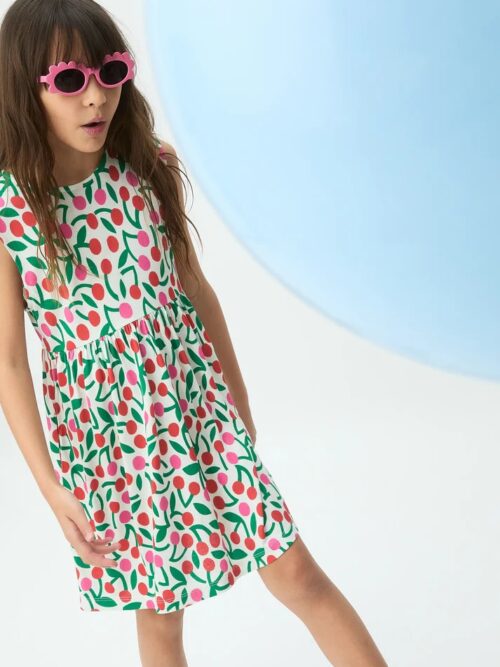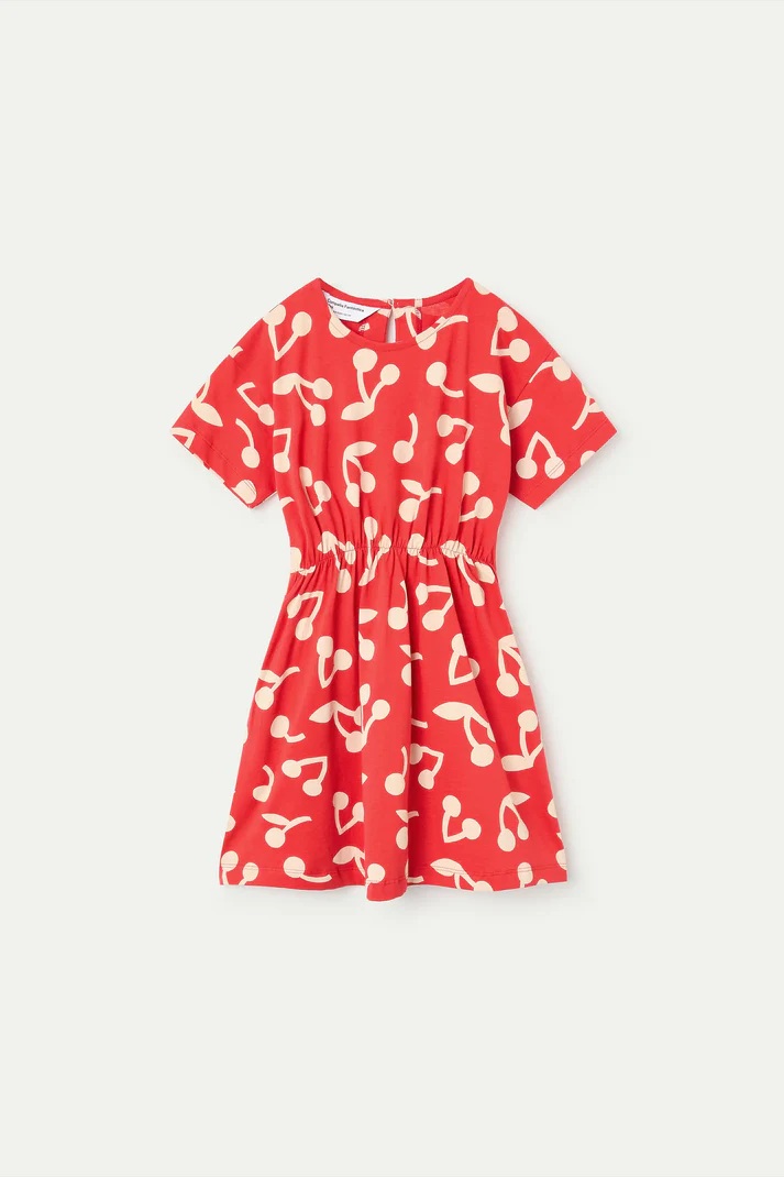 Vestido corto de niña en ligero algodón, de color rojo con estampado de guinda. Cuello redondo y manga corta. Hombros ligeramente caídos. Cintura elástica ajustable. La modelo mide 126 cm y lleva la talla 8-9 años.
